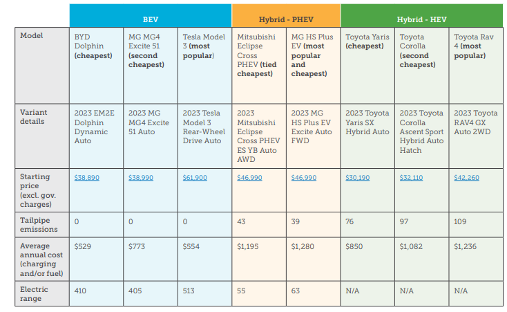 Finally, the following briefing paper prepared by the Climate Council gives some ideas of the potential costs of operating some of the more popular BEVs, PHEVs and HEVs currently available in Western Australia. Readers should bear in mind that this information is based on 2023 vehicle models and does not factor in essentials such as insurance, servicing, registration etc. This comparison is summarised in the table below.